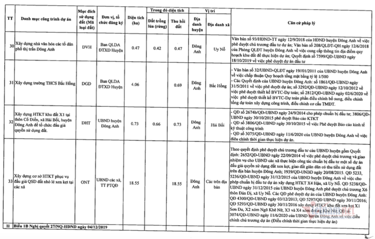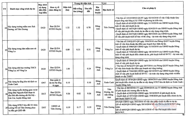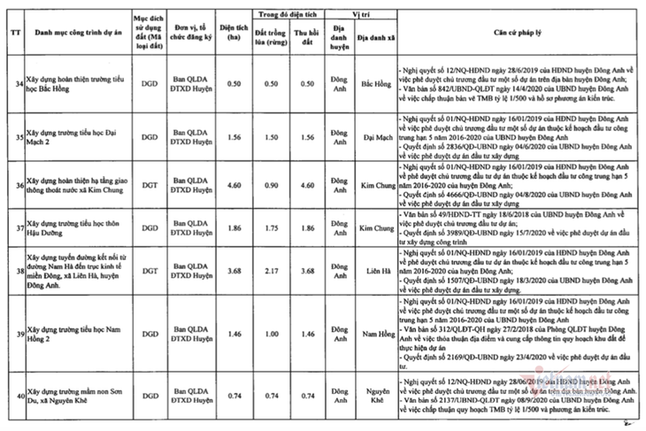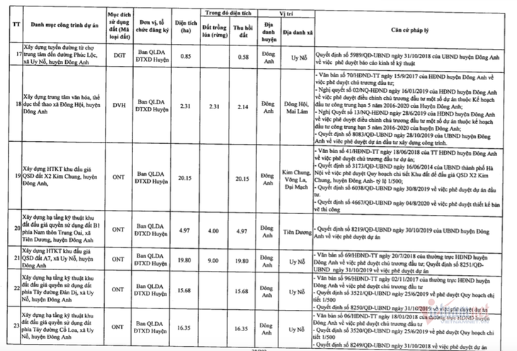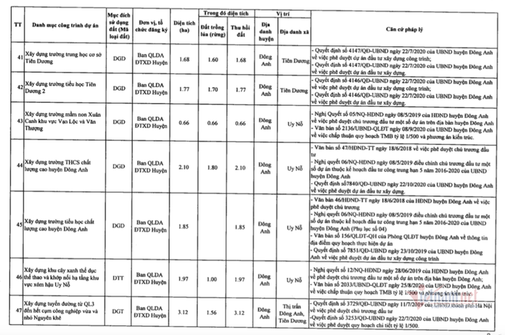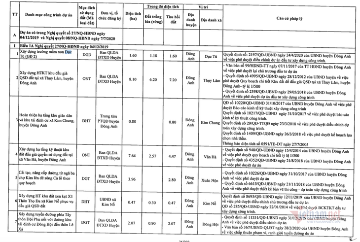 Theo nghị quyết số 21 về việc thông qua danh mục các công trình, dự án thu hồi đất năm 2021 được HĐND Thành phố Hà Nội phê duyệt, huyện Đông Anh có 136 dự án với tổng diện tích hơn 1.183ha. Trong đó, diện tích thu hồi đất là hơn 1.023ha, diện tích chuyển mục đích đất lúa là 171,98ha.