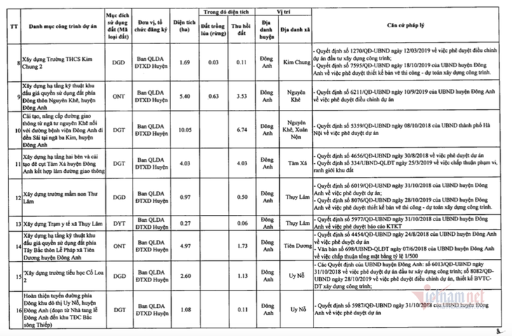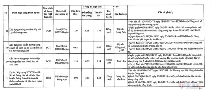 Danh sách chi tiết các dự án sẽ thu hồi đất năm 2021 trên địa bàn huyện Đông Anh: