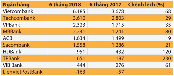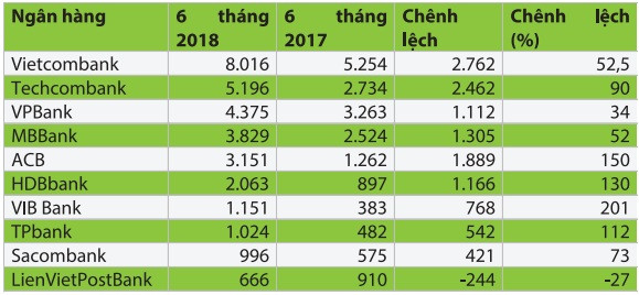 Khảo sát của Báo Đấu thầu tại 10 ngân hàng (Vietcombank, Techcombank, VPBank, MBBank, ACB, HDBank, TPBank, Sacombank, VIB Bank và LienVietPostBank) cho thấy, tổng lợi nhuận trước thuế 6 tháng đầu năm 2018 vào khoảng 30.400 tỷ đồng, tăng 66% so với nửa đầu năm 2017. Mức tăng trưởng này cao hơn đáng kể mức bình quân toàn ngành ngân hàng năm 2017 là 44,5%. Ngoại trừ LienVietPostBank, 9 ngân hàng còn lại đều có mức tăng trưởng lợi nhuận nửa đầu năm 2018 “đột biến” so với cùng kỳ năm ngoái.