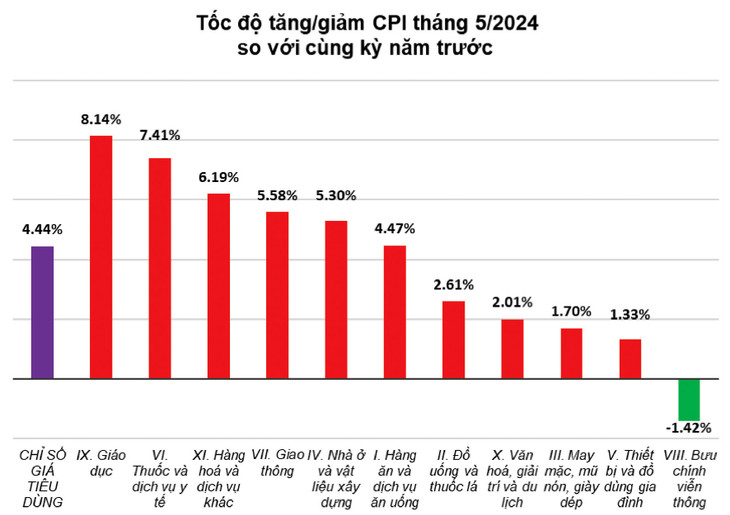 Theo TS. Ngô Trí Long, chuyên gia kinh tế, chỉ số CPI tháng 5/2024 lên tới 4,44% là mức khá cao trong nhiều tháng trở lại đây. Dù vẫn còn dư địa, nhưng cơ quan quản lý cần cẩn trọng trong điều hành giá cả thị trường bởi từ nay đến cuối năm còn nhiều yếu tố có thể đẩy lạm phát cao hơn. Trong đó, chính sách tăng lương từ tháng 7/2024 được dự báo sẽ có tác động nhiều chiều tới lạm phát.