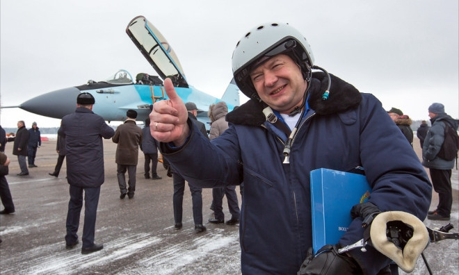 Phi công thử nghiệm Mikhail Belyaev của tập đoàn MiG sau chuyến bay với MiG-35.