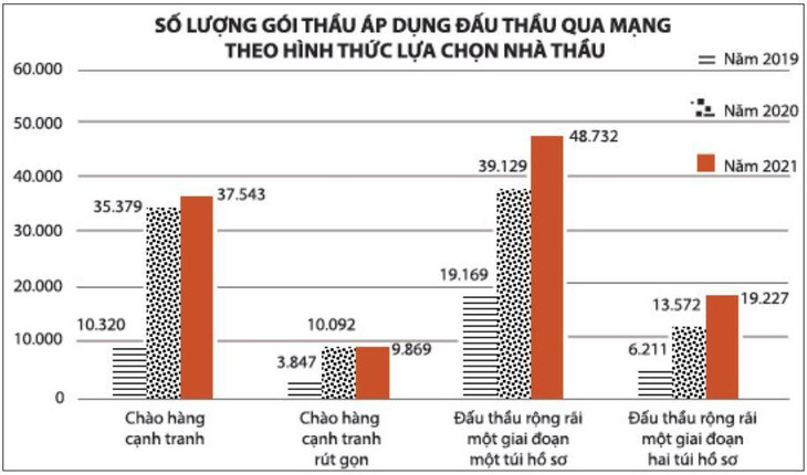 Cụ thể, năm 2021 có 115.371 gói thầu (năm 2020 là 98.172 gói, năm 2019 là 39.547 gói) được lựa chọn nhà thầu qua mạng. Trong đó, tính đến hết 31/12/2021, có 94.661 gói thầu ĐTQM đã có kết quả lựa chọn nhà thầu với tổng giá gói thầu khoảng 391.272 tỷ đồng, tổng giá trúng thầu khoảng 374.979 tỷ đồng, tiết kiệm đạt 4,16%.