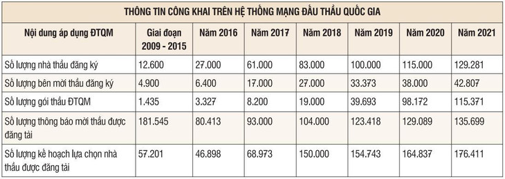 Trong đó, đối với chủ đầu tư, bên mời thầu, thời gian lựa chọn nhà thầu qua mạng (từ khi phát hành hồ sơ mời thầu (HSMT) đến khi có quyết định phê duyệt kết quả lựa chọn nhà thầu) so với đấu thầu truyền thống trung bình tiết kiệm được 8 ngày, quy đổi theo chi phí tiền lương/ngày công là khoảng trên 532 tỷ đồng.