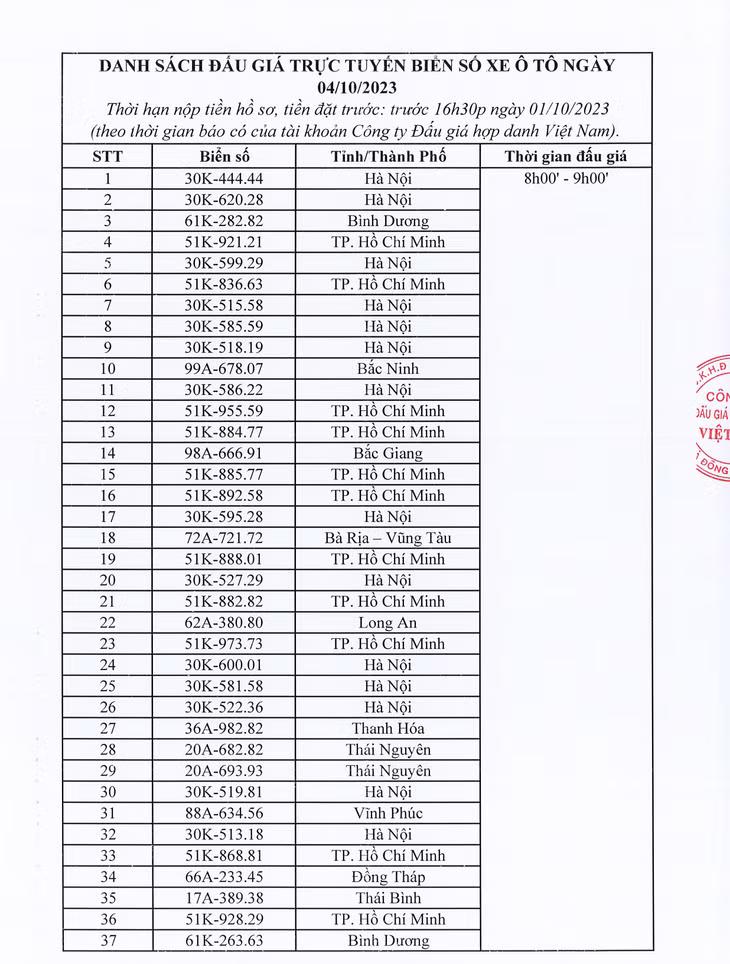 Dưới đây là danh sách biển số ô tô và các phiên đấu giá trực tuyến ngày 4/10: