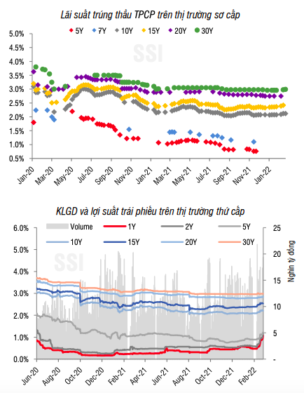 Trên thị trường trái phiếu Chính phủ, lãi suất thứ cấp tăng mạnh ở các kỳ hạn ngắn. Cụ thể, lợi suất trái phiếu tăng đáng kể ở các kỳ hạn 5 năm trở xuống phản ánh lo ngại về lạm phát và rủi ro địa chính trị. Kết tuần đóng cửa như sau: 1 năm (1,08%, tăng 0,21 điểm phần trăm), 3 năm (1,23%; 0,18 điểm phần trăm); 5 năm (1,23%, 0,12 điểm phần trăm); 10 năm (2,21%, 0,01 điểm phần trăm); 15 năm (2,54%, không đổi); 20 năm (2,85%, 0,02 điểm phần trăm).