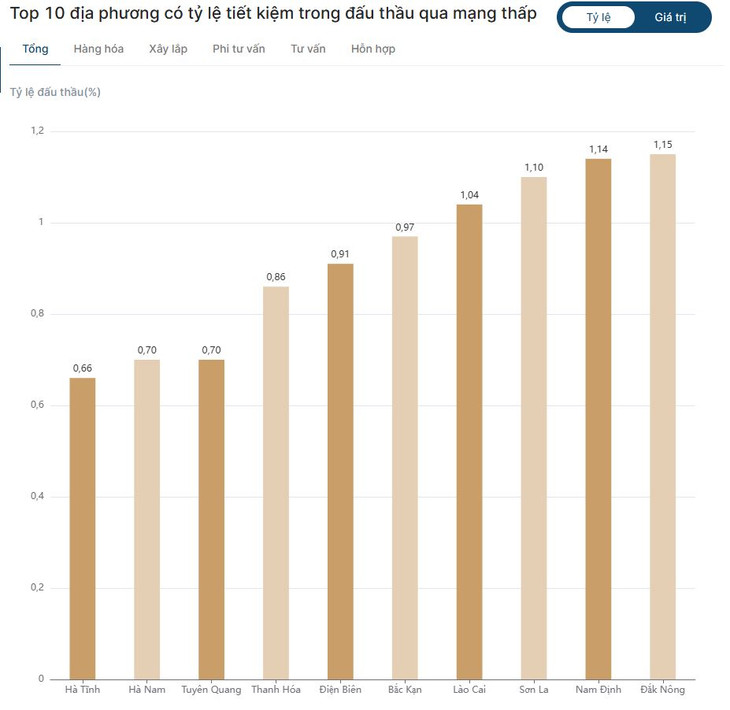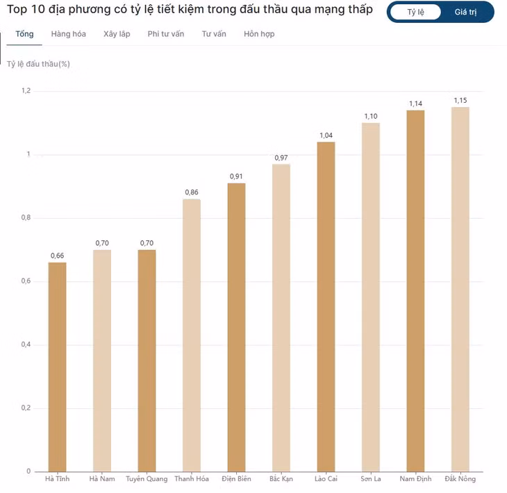 Đến thời điểm 16 giờ 13 ngày 13/11/2024, TOP 5 địa phương có tỷ lệ tiết kiệm trong đấu thầu qua mạng cao là: Đồng Tháp đạt tỷ lệ tiết kiệm 8,64%, Quảng Nam 7,59%, Khánh Hòa 7,51%, Cần Thơ 7,02%, Đà Nẵng 6,56%. Ở thời điểm giữa tháng 10, Trà Vinh cũng lọt vào TOP này.