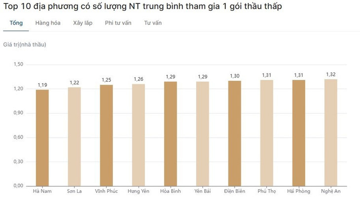 Điểm trùng hợp là nhiều địa phương trong TOP 10 địa phương có tỷ lệ tiết kiệm thấp sau ĐTQM cũng nằm trong TOP 10 địa phương có số lượng nhà thầu trung bình tham gia 1 gói thầu thấp. Hà Nam dẫn đầu TOP 10 địa phương có số lượng nhà thầu trung bình tham gia 1 gói thầu thấp với 1,19 nhà thầu/gói thầu, Sơn La là 1,22, Hưng Yên 1,26, Điện Biên 1,3, Nghệ An 1,32.