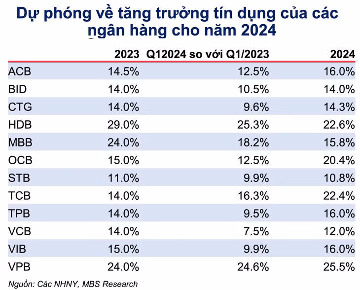 Dựa trên đánh giá về diễn biến kinh tế vĩ mô và hoạt động của các tổ chức tín dụng trong nửa đầu năm nay, Nhóm nghiên cứu Công ty Chứng khoán MB (MBS) kỳ vọng, tăng trưởng tín dụng sẽ đạt 14% vào năm 2024 với mức tăng trưởng GDP dự kiến là 6,3% - 6,5% cho cả năm. Trong đó, tín dụng cho lĩnh vực tài chính tiêu dùng, thẻ tín dụng và cho vay mua ô tô dự kiến sẽ có nhu cầu cao hơn nhờ lãi suất cho vay thấp và doanh số bán lẻ phục hồi. Bên cạnh đó, bất động sản - nguồn tín dụng chủ yếu đã có một số dấu hiệu phục hồi tích cực, nhất là số thu thuế liên quan đến đất đai trong quý I/2024 tăng trưởng tốt hơn so với cùng kỳ 2023. Mặt khác, hoạt động xuất nhập khẩu được kỳ vọng sẽ tăng trưởng cao trong nửa cuối năm 2024, tiếp nối đà tăng trong những tháng đầu năm.