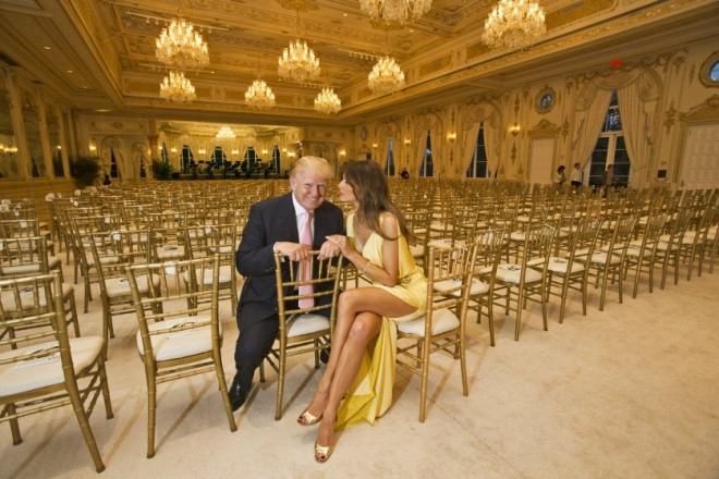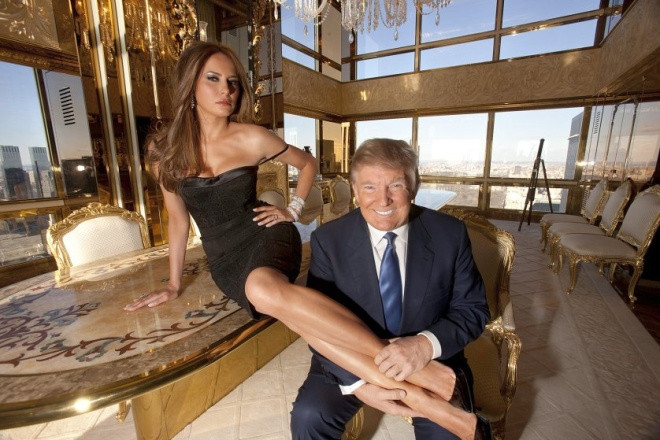 Trump và vợ ba, Melania ngồi trên bàn mạ vàng, chân đặt lên đùi chồng trong căn hộ tại Tháp Trump ở thành phố New York năm 2014.