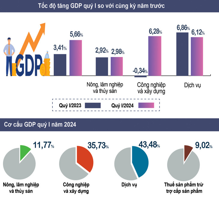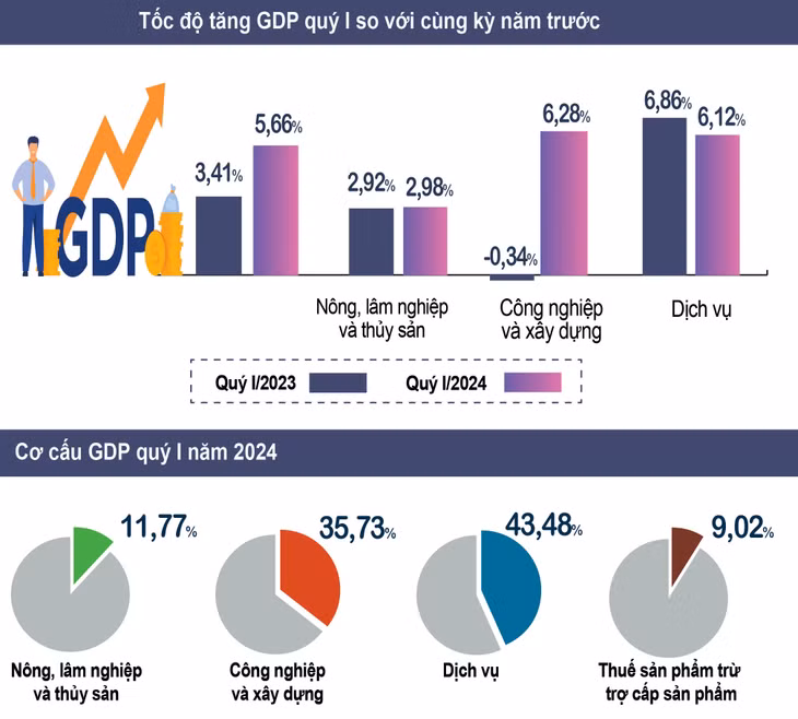Quý I/2024, khu vực công nghiệp và xây dựng tăng trưởng tốt hơn cùng kỳ năm trước, đạt 6,28% (riêng công nghiệp tăng 6,18%), cao hơn nhiều so với kịch bản cao 5,5% đề ra tại Nghị quyết 01. Khu vực nông, lâm nghiệp và thủy sản và khu vực dịch vụ đạt mức tăng trưởng lần lượt là 2,98% và 6,12%, thấp hơn mức tăng của cả 2 kịch bản tăng trưởng.