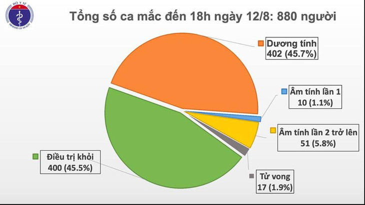 Tính đến 18h ngày 12/8, Việt Nam, có tổng cộng 880 ca mắc COVID-19, trong đó 321 ca nhiễm nhập cảnh được cách ly ngay. Số lượng ca mắc mới liên quan đến Đà Nẵng tính từ ngày 25/7 đến nay đã ghi nhận 419 ca. Tính từ 6h đến 18h ngày 12/8, Việt Nam ghi nhận 14 ca mắc mới