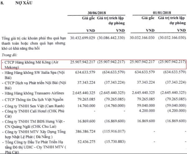 Đáng chú ý, BCTC của ACV ghi nhận giá trị các khoản phải thu quá hạn thanh toán hoặc khó có khả năng thu hồi tính đến cuối quý 2/2018 là 30 tỷ đồng. Đáng chú ý, chiếm tỷ trọng lớn nhất là khoản phải thu từ Hàng không Mê Kông - Air Mekong với gần 26 tỷ đồng. Đây là khoản phát sinh từ hợp đồng cung cấp dịch vụ cất hạ cánh, bãi đỗ và được ACV trích lập dự phòng toàn bộ.