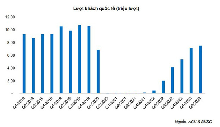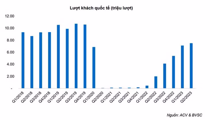 Quý II/2023, lượt khách quốc tế của ACV đạt 7,5 triệu lượt, tương đương 76% cùng kỳ năm 2019, là năm trước đại dịch Covid-19. Lượt khách quốc tế hiện chiếm 25,7% tổng lượt khách trong quý II/2023, nhưng đóng góp tới 62,4% doanh thu dịch vụ hành khách, là doanh thu chính của ACV.