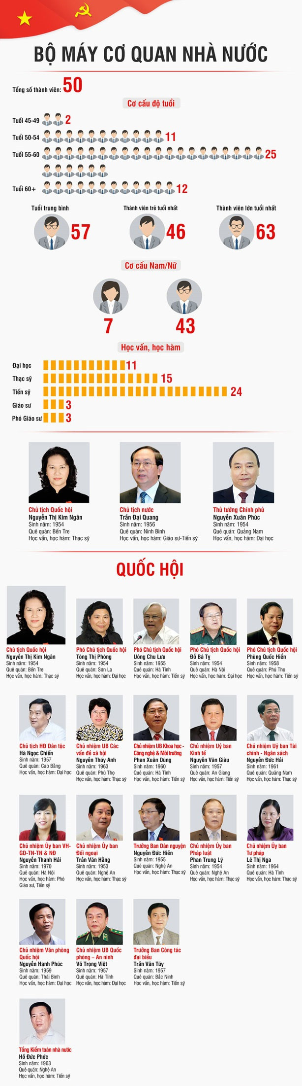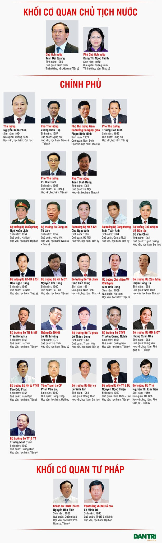 Cùng với các chức danh Chủ tịch Quốc hội, Chủ tịch nước, Thủ tướng Chính phủ, nhiều chức danh quan trọng khác của khối các cơ quan Quốc hội, Chính phủ và khối cơ quan Tư pháp vừa mới được Quốc hội bầu và phê chuẩn.
