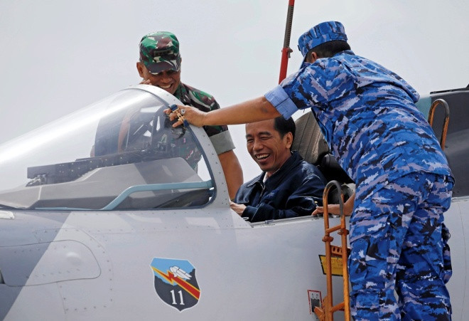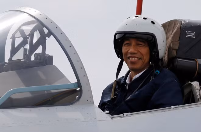 Ngay sau khi tới sân bay, Tổng thống Indonesia thị sát thiết bị của không quân. Ông đội mũ bảo hiểm, ngồi trên chiến đấu cơ Sukhoi do Nga sản xuất. Ảnh: Reuters