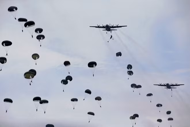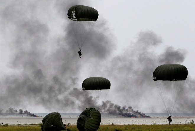 Các binh sĩ Indonesia nhảy dù từ máy bay vận tải quân sự Hercules C-130 trong cuộc tập trận tại căn cứ không quân Ranai, quần đảo Natuna. Dù không phải là bên tranh chấp chủ quyền ở Biển Đông, Indonesia phản đối Trung Quốc đưa vùng biển quanh quần đảo Natuna vào "đường 9 đoạn", hay "đường lưỡi bò" Bắc Kinh dùng để tuyên bố chủ quyền phi pháp với khu vực. Ảnh: Reuters