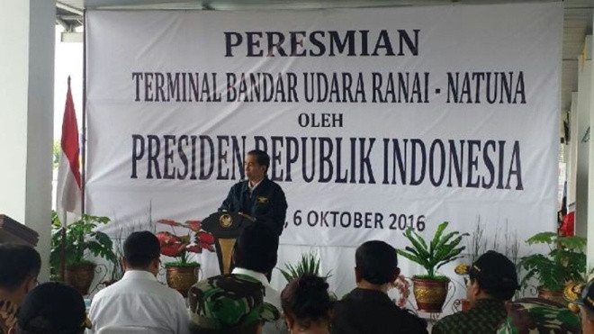 Ông Widodo hôm qua cũng chính thức khánh thành một nhà ga mới tại sân bay thương mại ở Ranai, thủ phủ quần đảo Natuna. Sân bay giúp trở thành cầu nối giữa Natuna với Tanjung Pinang, thành phố thủ phủ tỉnh đảo Riau và các thành phố khác như Batam. Ảnh: JakartaPost