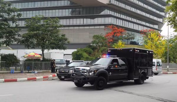 Đoàn xe hộ tống Tổng thống Obama rời khách sạn Marriott đến Trung tâm hội nghị quốc gia.
