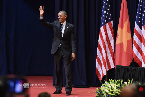 Ông Obama xuất hiện. Toàn hội trường đứng dậy vỗ tay. "Xin chào. Xin chào Việt Nam", Tổng thống thống Mỹ nói to bằng tiếng Việt.