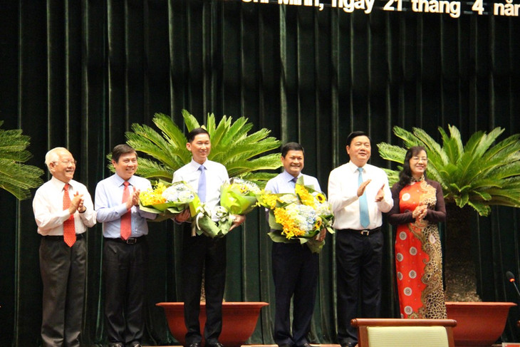 | Bí thư Thành ủy TPHCM Đinh La Thăng tặng hoa chúc mừng 2 tân Phó Chủ tịch UBND TP |