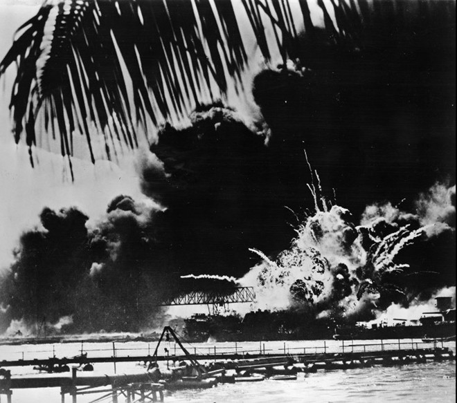 Khói bao trùm tàu USS Arizona khi nó bị nghiêng và chuẩn bị chìm. Ảnh: AP.