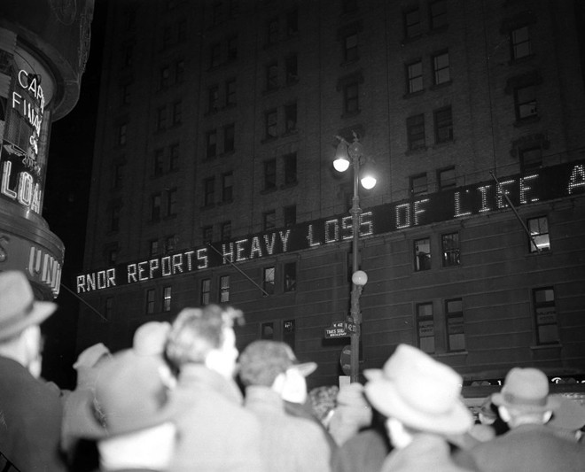 Trong ảnh, người dân Mỹ tập trung tại Quàng trường Thời đại, New York, theo dõi thông tin thiệt hại trong trận Trân Châu Cảng. Ảnh: AP.
