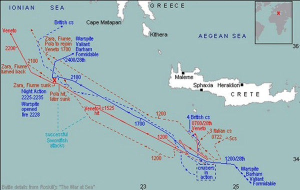 Ngư lôi từ chiến đấu cơ Swordfish tiếp tục bắn nổ nồi hơi của tuần dương hạm hạng nặng Pola, khiến con tàu chết máy trên biển. Chỉ huy hải quân Italy quyết định điều hai tuần dương hạm và 4 khu trục hạm tới để cứu kéo tàu Vittorio Veneto về căn cứ mà không hề biết rằng hạm đội Anh đang phục kích ở gần đó.