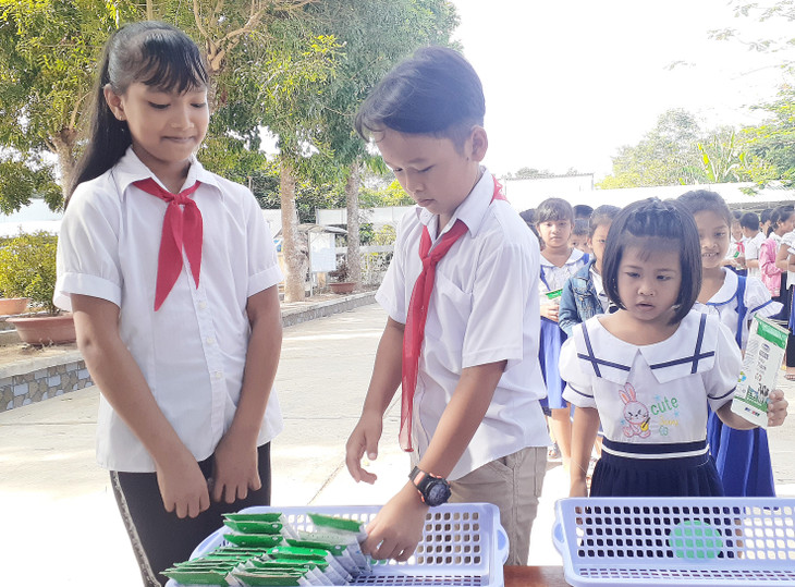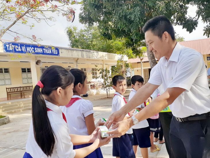 Các thầy cô giáo phát sữa cho các em học sinh nhân ngày đầu tiên bắt đầu uống sữa học đường