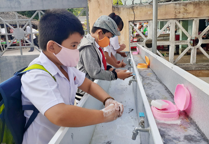 Học sinh được hướng dẫn đeo khẩu trang ở nơi đông người và rửa tay trước khi vào lớp học