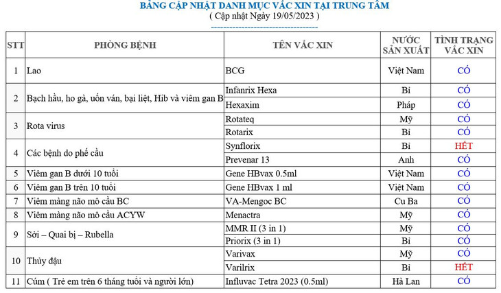 | Theo Bảng cập nhật danh mục vắc xin của Trung tâm Trung tâm tiêm chủng 131 Lò Đúc, Hà Nội của Viện Vệ sinh dịch tễ trung ương ngày 19/5/2023, vắc xin “3 trong 1” bạch hầu - ho gà - uốn ván đang hết... |