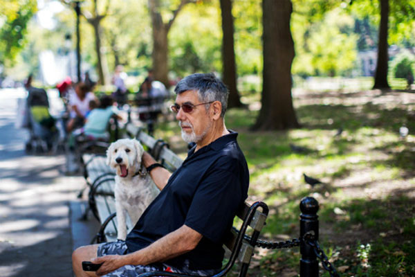Tại một công viên ở Manhattan, Guillermo Vidal, 75 tuổi, nhăn mặt khi nghĩ đến việc ông Trump lên làm tổng thống. Ngồi cạnh ông là chú chó Dipsy với bộ mặt rầu rĩ.