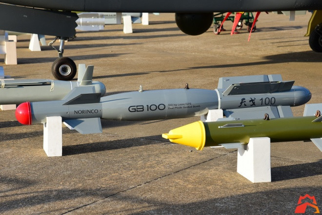 Tập đoàn Công nghiệp Quốc phòng Hoa Bắc (Norinco) trưng bày bom thông minh GB-100 có trọng lượng 100 kg, sử dụng hệ thống dẫn đường laser và vệ tinh. Ảnh: Sina.