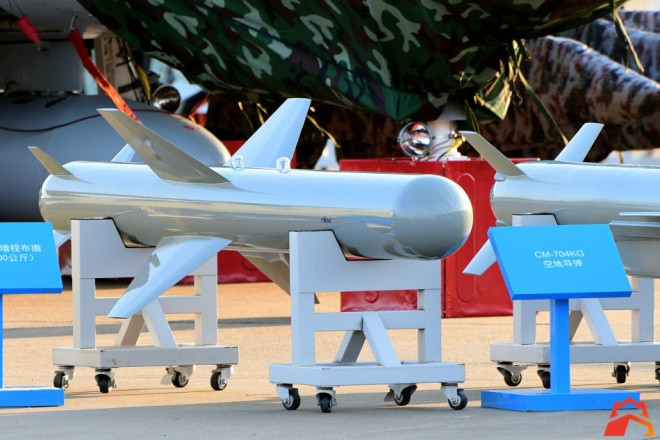 Tên lửa không đối đất CM-704KG có tầm bắn tối đa 25 km, sử dụng đầu dò radar để phát hiện và tấn công các mục tiêu trên chiến trường. Theo truyền thông Trung Quốc, sản phẩm này có tiềm năng xuất khẩu rất lớn. Ảnh: Sina.