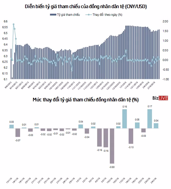 Ngày 24/2, Ngân hàng Trung ương Trung Quốc (PBoC) ấn định tỷ giá tham chiếu của đồng nhân dân tệ ở mức 6,5302CNY/USD, tương ứng mức tăng 0,04% so với phiên trước.