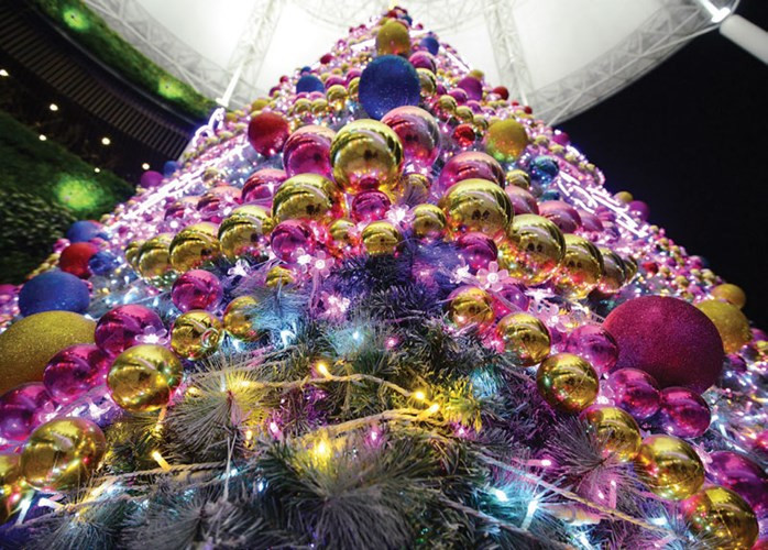 Cây thông Noel cao 15m tại Trung tâm Thương mại Aeon Mall Long Biên trang trí bằng đèn led, hoa sakura, trái châu... lung linh về đêm