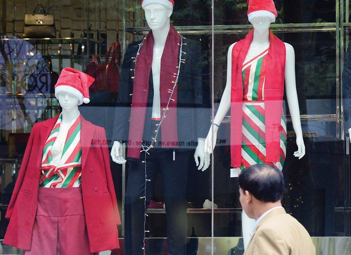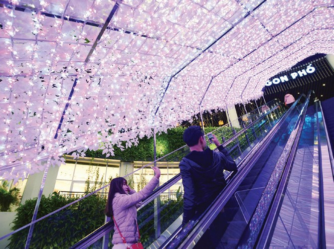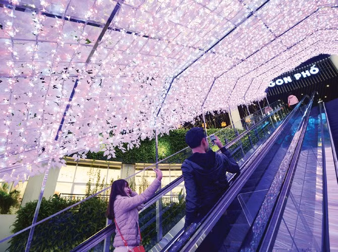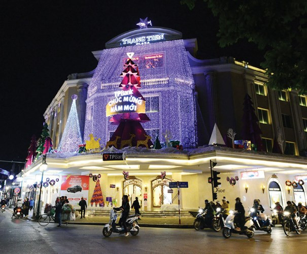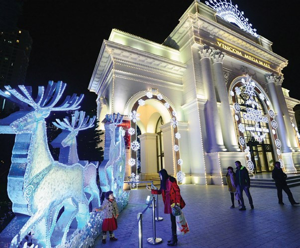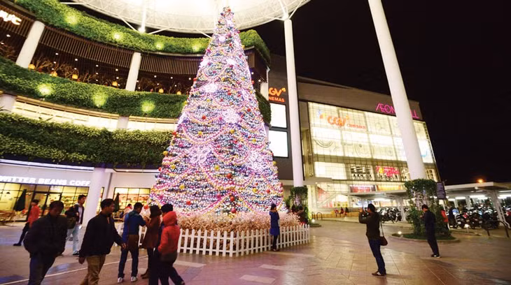 Với mong muốn thu hút khách hàng dịp mua sắm lớn nhất trong năm, các trung tâm thương mại lớn ở Hà Nội đua nhau trang trí Giáng sinh độc đáo với nhiều tiểu cảnh đẹp mắt, như cây thông Noel, đường tuyết, thang ánh sáng…
