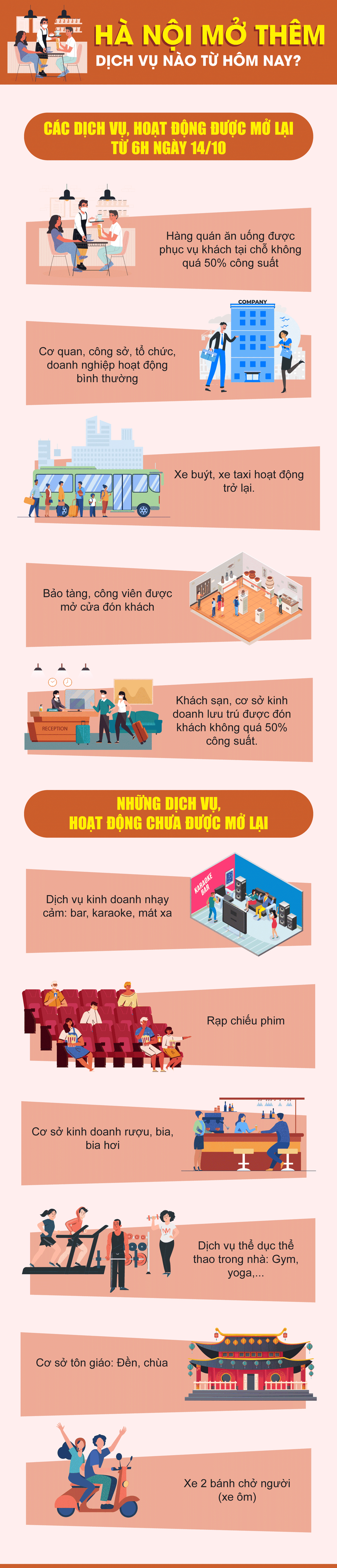 Từ 6h sáng 14/10, có thêm 5 nhóm hoạt động, dịch vụ được Hà Nội cho phép hoạt động trở lại với điều kiện phải tuân thủ một số quy định phòng, chống dịch kèm theo.