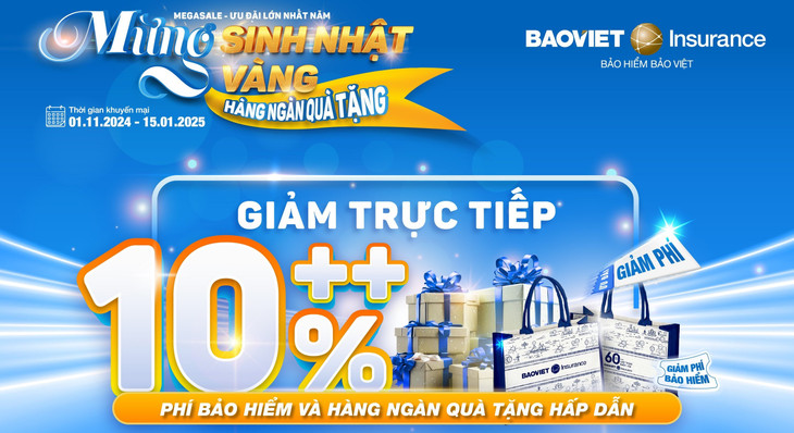 Tiếp nối hành trình phụng sự khách hàng, Bảo hiểm Bảo Việt tung chương trình ưu đãi “60 năm giữ trọn niềm tin - Mừng sinh nhật vàng, hàng ngàn quà tặng” đánh dấu cột mốc đặc biệt với tổng giá trị ưu đãi và quà tặng lên tới 15 tỷ đồng. Đây là cơ hội vàng để khách hàng sở hữu các gói bảo hiểm toàn diện, từ chăm sóc sức khỏe đến bảo vệ tài sản, mang lại sự an tâm và bảo vệ toàn diện cho cả gia đình.