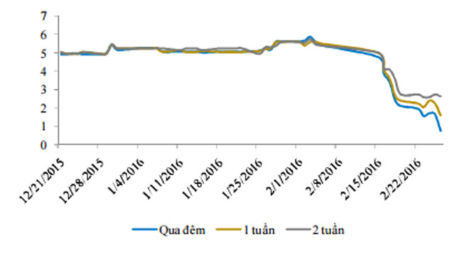 Đồng thời BVSC chỉ ra lãi suất liên ngân hàng tiếp tục xu hướng giảm mạnh sau dịp Tết Nguyên Đán. Cụ thể, lãi suất trung bình kỳ hạn qua đêm chỉ còn 1,79%/năm; kỳ hạn một tuần chỉ còn 2,27%/năm; kỳ hạn hai tuần chỉ còn 2,69%/năm – đều giảm hơn 1%/năm so với mức lãi suất của tuần trước đó.