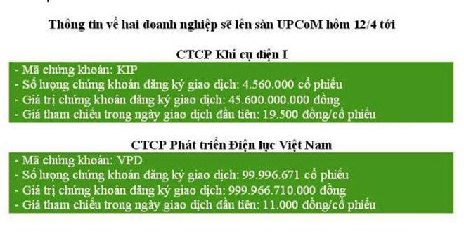 Đó là CTCP Khí cụ điện I và CTCP Phát triển Điện lực Việt Nam. Đây là 2 tân binh thứ 30 và 31 lên sàn UPCoM của Sở GDCK Hà Nội chỉ tính riêng trong năm 2016.