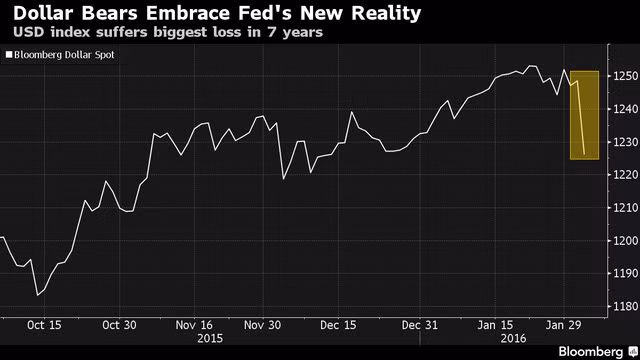 Đồng USD đã giảm giá mạnh nhất kể từ Cục dự trữ liên bang Mỹ (Fed) thông báo bắt đầu chương trình mua trái phiếu cách đây 7 năm. Nguyên nhân là do các báo cáo mới nhất về kinh tế Mỹ phát ra những tín hiệu cho thấy nền kinh tế đang tăng trưởng chậm lại và do đó rất có thể Fed sẽ phải đi chệch lộ trình tăng lãi suất đã đề ra cuối năm ngoái.