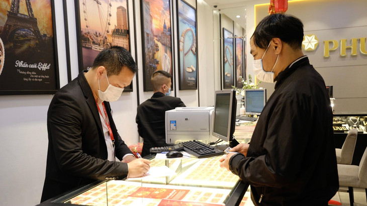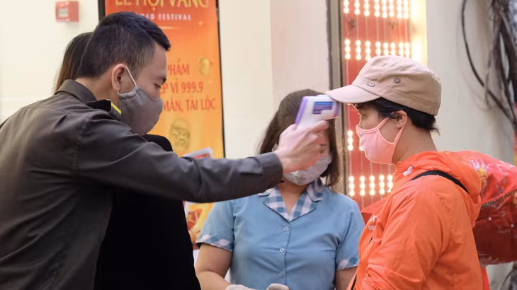 Trên "phố vàng" Trần Nhân Tông, vẫn có cảnh người dân xếp hàng từ 6h giờ sáng tại các cửa hiệu lớn để mua vàng, nhưng lượng người ít hơn rất nhiều so với mọi năm. Các cửa hàng lớn đều có vách ngăn phân luồng cho khách hàng ngồi đợi giao dịch, mỗi khách hàng vào cửa hàng đều được đo nhiệt độ và yêu cầu đeo khẩu trang, rửa tay sát khuẩn.