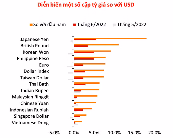 Trong tháng 6/2022, VND tiếp tục mất giá thêm 0,4% so với đồng USD sau khi đã mất giá khoảng 1,0% trong tháng 5. Lũy kế từ đầu năm đến nay, tiền đồng đã mất giá khoảng 2,0%. Tuy nhiên, VND vẫn là một trong những đồng tiền mất giá ít nhất trong khu vực Châu Á – Thái Bình Dương.