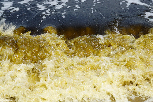 Những cơn sóng tấp dòng nước đen vào bờ, khi rút để lại những mảng bọt màu vàng. Nước mùi hôi, chạm tay vào có cảm giác nhớt.