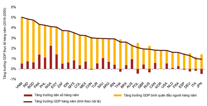Bà Đinh Thị Quỳnh Vân, Tổng Giám đốc PwC Việt Nam thông tin, Hai năm trước, báo cáo khảo sát của PwC dự báo rằng Việt Nam sẽ là nền kinh tế lớn thứ 22 thế giới vào năm 2050. Theo báo cáo cập nhật năm nay thì Việt Nam có thể sẽ lên tăng lên hạng thứ 20. Khi mà thế giới đang đối mặt với một số sự kiện chính trị nổi bật như việc Anh rời khỏi EU hay kết quả bầu cử tổng thống Mỹ gần đây, nhiều khả năng nền kinh tế toàn cầu sẽ có thêm những biến động lớn nữa từ nay đến năm 2050. Để thành công được trong sân chơi với nhiều biến động này Việt Nam sẽ cần tăng trưởng dựa trên nền tảng là những nỗ lực tái cơ cấu kinh tế bền vững hơn, thể chế hoàn thiện hơn, và một nền giáo dục - đào tạo chất lượng hơn để người lao động có thể đóng góp thực sự hiệu quả vào tăng trưởng kinh tế dài hạn.
