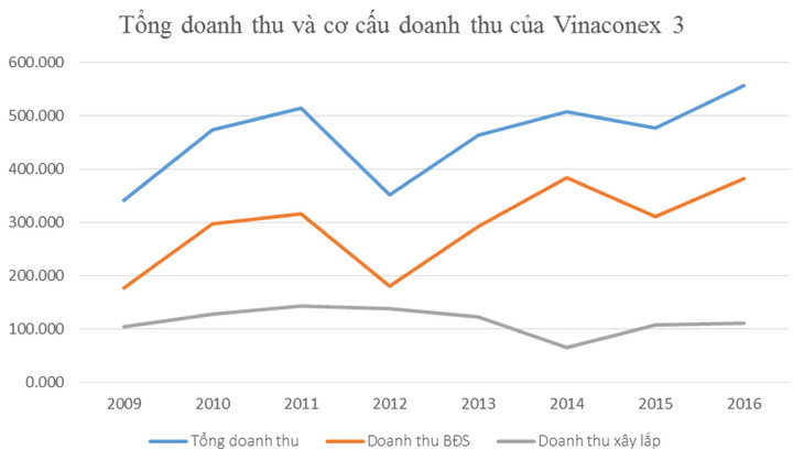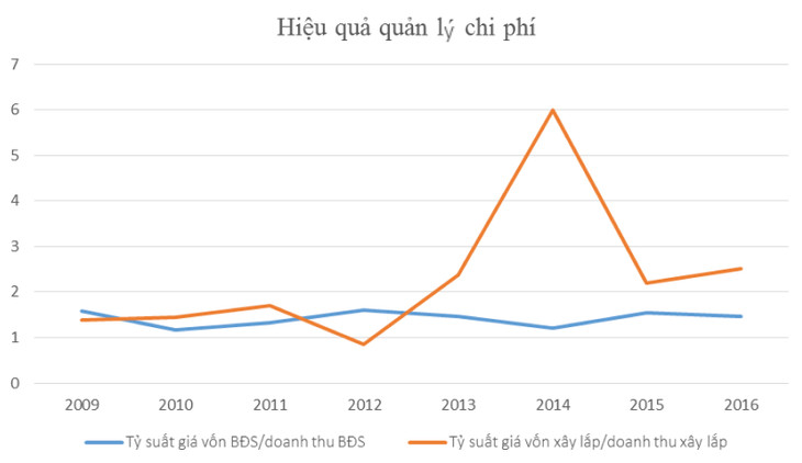 Hoạt động kinh doanh bất động sản để lại dấu ấn cho sự tăng trưởng của Vinaconex 3. Không chỉ đóng góp cho sự tăng trưởng cho năm 2016, hoạt động bất động sản luôn gắn liền với thăng trầm của Vinaconex 3. Hơn nữa, hiệu quả quản lý chi phí hoạt động kinh doanh bất động sản cũng tốt hơn so với xây lắp (xem thêm Biểu đồ 2).