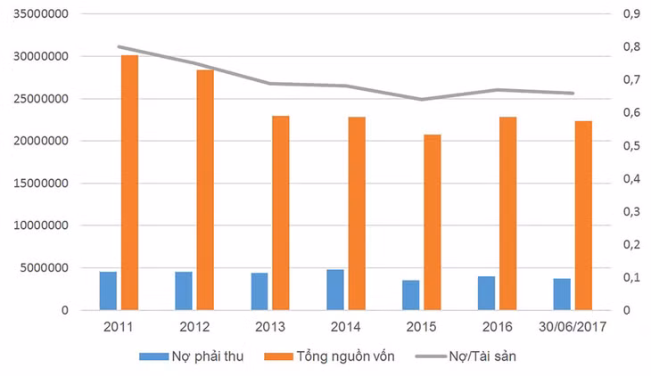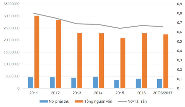 Thông qua biểu đồ diễn biến nguồn vốn của Vinaconex từ 2011 - 2016, các khoản phải thu của doanh nghiệp này có xu hướng giảm dần từ năm 2011 đến năm 2016. Cùng với đó, nguồn vốn của Tổng công ty cũng giảm dần. Điều đó cho thấy, khi bị chiếm dụng vốn thì Tổng công ty đã phải tìm nguồn vốn khác để bù đắp.