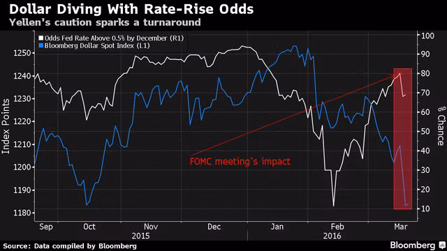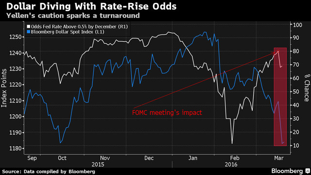 Sau khi Fed họp, các nhà đầu tư đặt ra câu hỏi, có phải những ngày đồng USD tăng giá đã kết thúc? Từ thời điểm đồng USD ở mức thấp nhất năm 2011 cho đến mức đỉnh vào ngày 22/1/2106, chỉ số của Bloomberg tăng đến 37%. Điều này có được do kỳ vọng về kinh tế đi lên, lãi suất tăng trong khi ở nhiều nơi khác vẫn còn đang trì trệ.