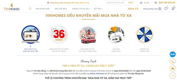 Nhân dịp ra mắt, Sàn Thương mại điện tử Bất động sản Vinhomes Online áp dụng chương trình ưu đãi đặc biệt – “Mua nhà từ xa, giảm giá trực tiếp” cho 600 giao dịch đầu tiên thành công tại các dự án Vinhomes Ocean Park, Vinhomes Smart City và Vinhomes Symphony. Mức giảm từ 10 - 70 triệu/căn, trong đó, 100 căn đầu tiên được giảm giá đến 70 triệu đồng.