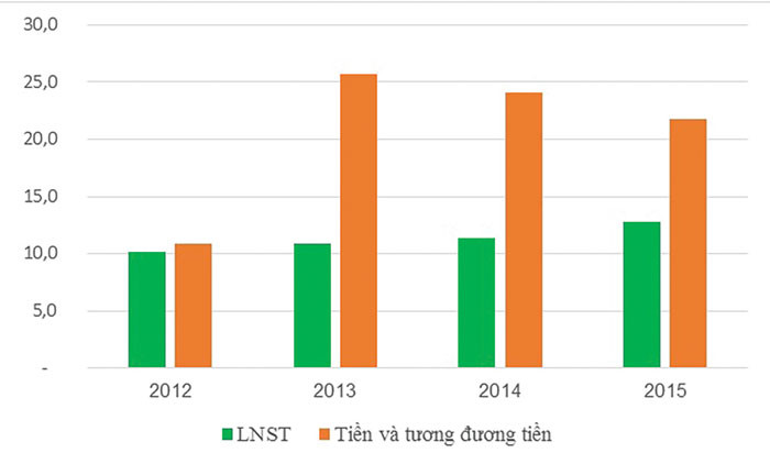 Bên cạnh đó, số dư tiền và tương đương tiền của NXB Trẻ luôn dồi dào, đều đặn ở con số trên 20 tỷ đồng. Số dư tiền của Công ty thậm chí còn cao hơn cả lợi nhuận đạt được hàng năm. Cuối năm 2015, số dư tiền của NXB Trẻ đạt 21,8 tỷ đồng.